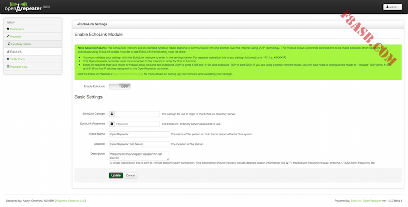 Suite à l’article paru sur ce blog, voici un aperçu en images de l’interface web en cours de développement fonctionnant avec SVXLINK, projet Open Repeater. L’image ci-dessus correspond au Dashboard, c’est la première page après avoir effectué le login et mot de passe.