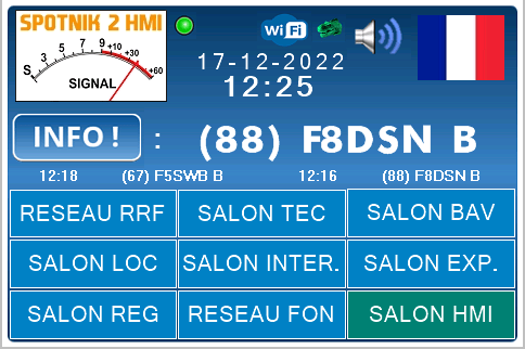 La nouvelle page trafic, montre le salon connecté avec le bouton sur fond vert, le bouton rouge nous indique qu’il y a du trafic et vous informe de la station en QSO.