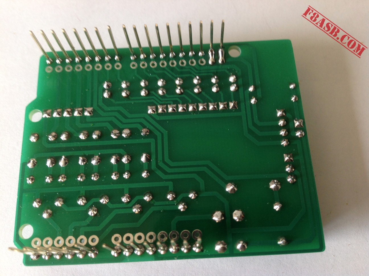 c_arduino shield4On termine par le Buzzer, polarisé lui aussi le + vers le bas et les connecteurs Arduino shield. Pour un positionnement optimal, je vous conseille de monter les supports sur l’Arduino est de souder une pastille à chaque extrémité du connecteur.